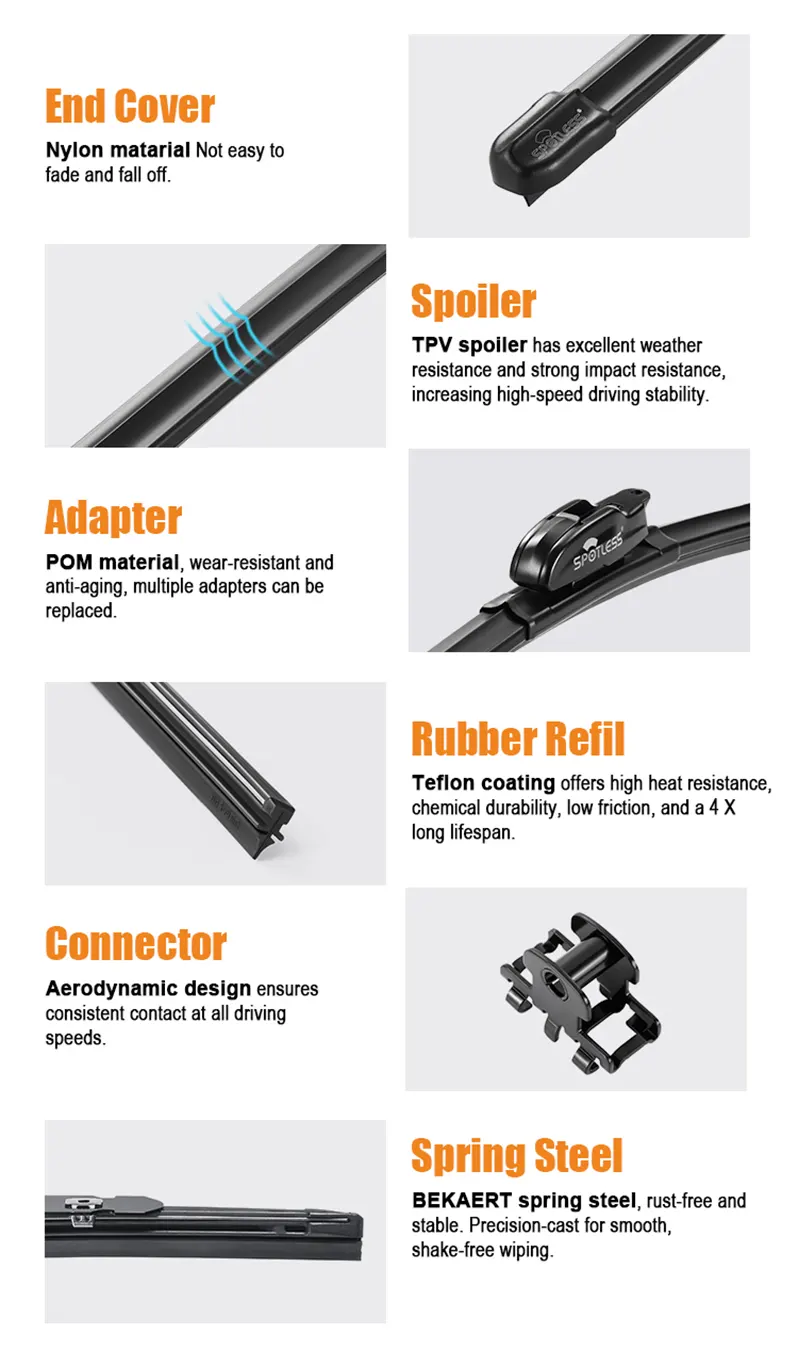 Anni di feedback dalle officine ci hanno insegnato dove i tergicristalli falliscono: sollevamento dei bordi sotto la pioggia, vibrazioni a velocità autostradale o rottura dei connettori durante l'installazione. Il nostro design brevettato della testa interna rinforza l'acciaio legato in modo che non si fratturi anche quando fa freddo. Il bordo in gomma ha una geometria "ribaltata" per rimanere centrato e i connettori sono realizzati per adattarsi a quasi tutte le autovetture senza sbattere. Sono piccoli dettagli, ma fanno una grande differenza nell’uso quotidiano.