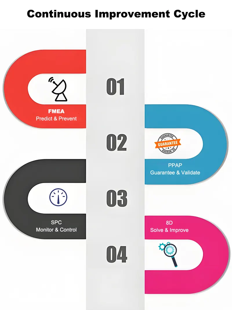 Prevenzione integrata: utilizziamo la FMEA per prevedere i guasti prima della produzione. I problemi vengono risolti sulla carta, non nel tuo magazzino. |